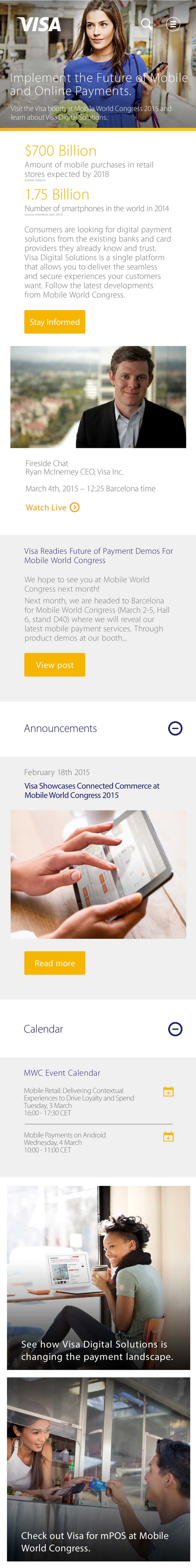 Visa approached gyro to design new webpages and e-blasts to introduce their newest services at the Mobile World Conference. The new pages needed to be responsive while also matching current branding for Visa.com. As the only source to learn more about the new services, they needed to be very easy to understand and provide a positive experience to all users.
